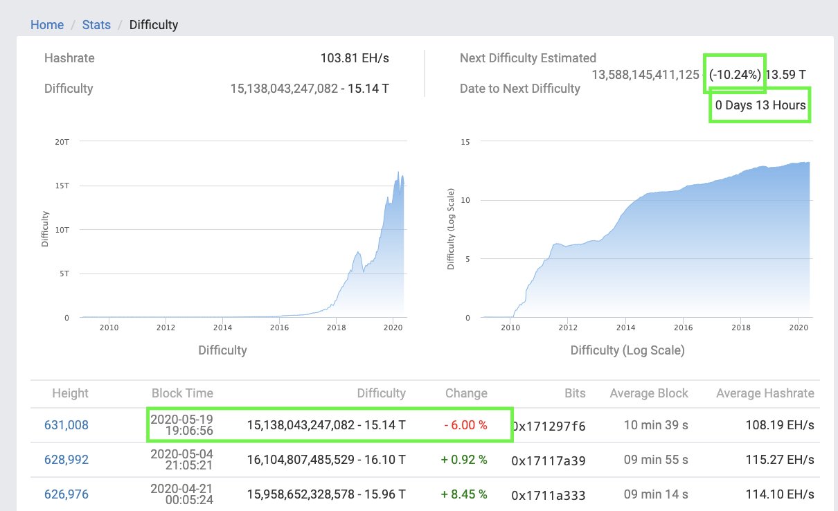 A difficulty adjustment before the mining reward cut earlier this year had caused the bitcoin price to drop. The cryptocurrency fell from $9,989.39 to $8,785.52 in just three days.
