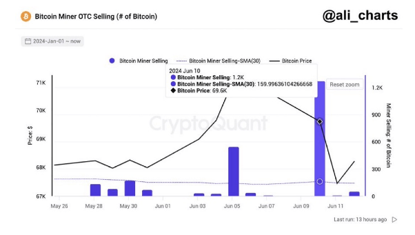 Bitcoin’s price is currently on a downward trend, fueled by selling pressures from Bitcoin miners who have sold more than 1,200 BTC, valued at $79.20 million. As of writing, the cryptocurrency’s value has fallen to $66,145 reflecting a 4.70% decrease over the past seven days, according to CoinMarketCap.