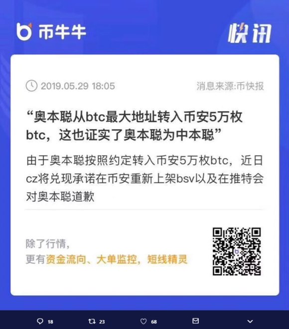 CSW transferred 50k BTC from the biggest BTC wallet to Binance, which confirmed he is the real Satoshi. As such CZ will re-list BSV and make an official apology on Twitter.