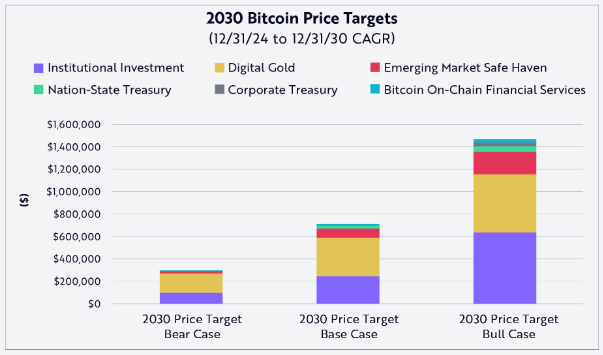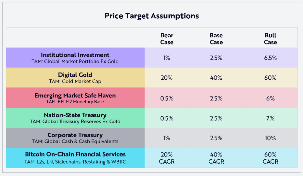The report also takes into account nation-state adoption and corporate treasury strategies as other factors that will contribute to the value of Bitcoin in the future.