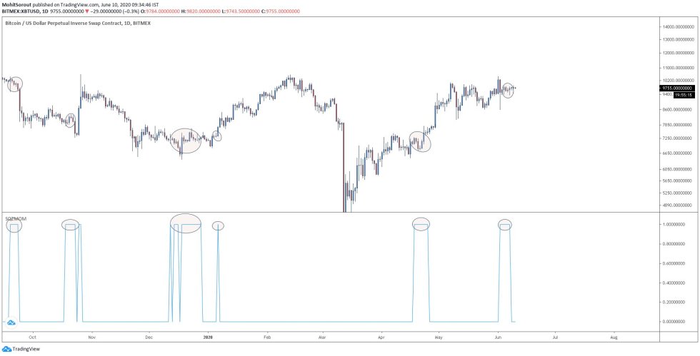 While looking at the above chart, it does appear that the Squeeze Momentum indicator he referenced above seems to spike during bouts of consolidation that are followed by sharp upwards movements.