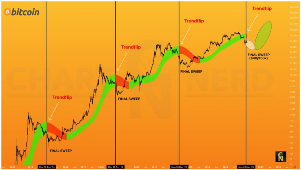 Bitcoin is currently down by about 47% from its October 2025 peak price of $126,080. There is still a possibility of further downside from this point, but most of the structural damage to price has already occurred. ChartNerd’s current read places the projected final low somewhere in Q2 and Q3 2026, with a target sweep range between $40,000 and $50,000.