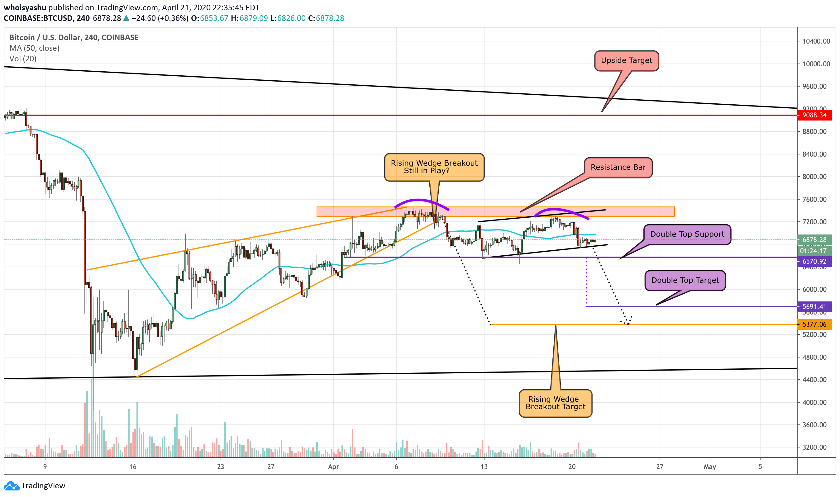 Both Rising Wedge (oranged) and Double Top (purpled) foresee the bitcoin price to fall anywhere between $5,377 and $5,691.