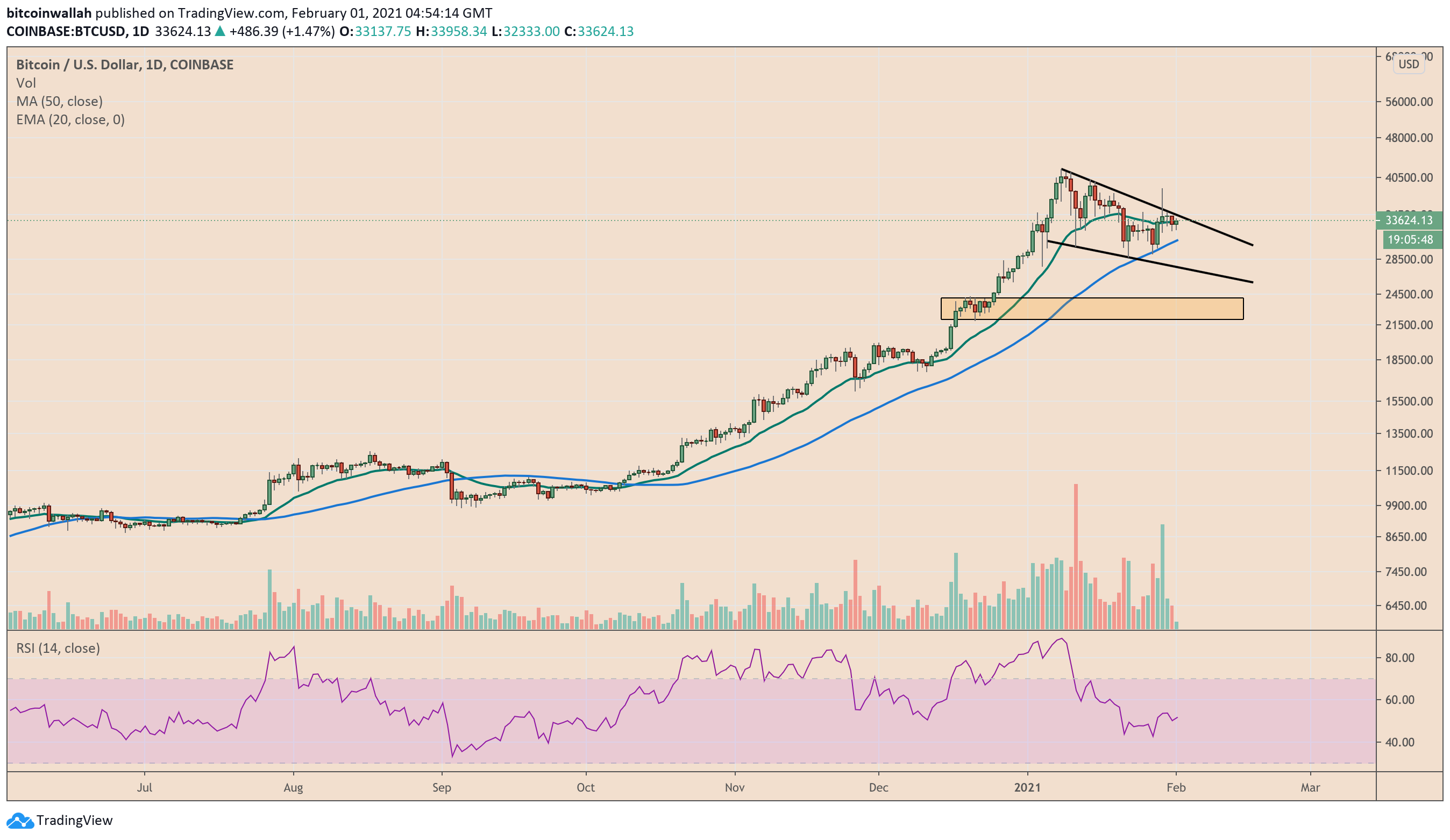 A push above the Falling Wedge resistance trendline, supported by an increase in volume, could have traders view short-term upside targets above $40,000. A further push and Bitcoin could reach another all-time high by crossing over $41,986.