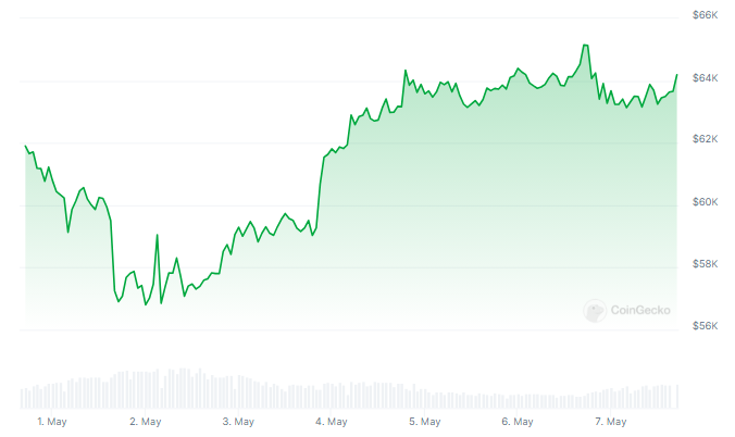 At the time of writing, BTC was trading at $63,765, down 1.2% in the last 24 hours, and sustained a meager 0.6% gain in the last seven days, data from Coingecko shows.