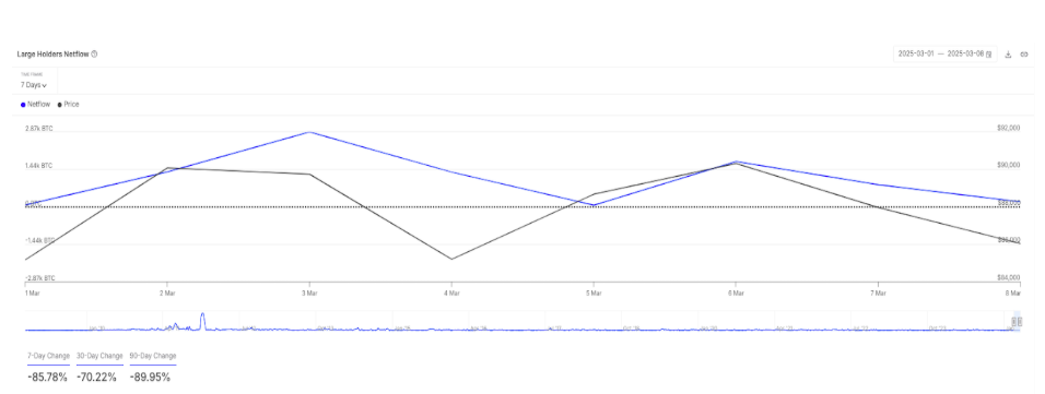 IntoTheBlock’s whale transaction metrics follow addresses holding at least 0.1% of the total circulating supply of Bitcoin. Over the past seven days, whale net flow has dropped by 85.78%, and in the past 30 days, it has declined by 70.22%. A sharp reduction in whale accumulation often signals diminishing confidence among major investors, leading to fears of increased selling pressure.