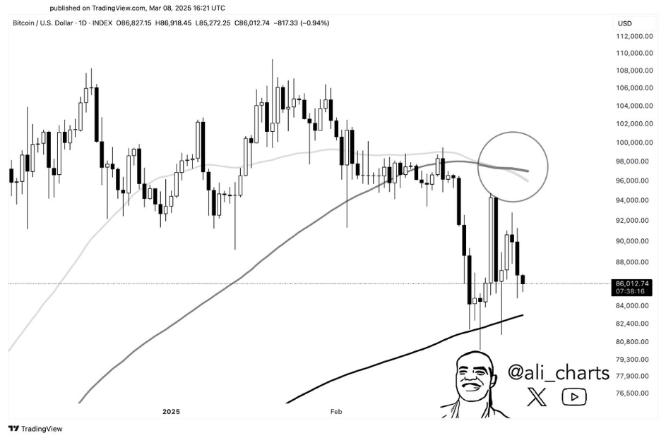 Adding to these concerns, crypto analyst Ali Martinez pointed out a technical development. As noted by the analyst, there’s been a crossover between the 50-day and 100-day moving averages on the daily candlestick timeframe chart. This crossover has seen the 50-day moving average crossing below the 100-day moving average, making it a death cross with downside risks if Bitcoin fails to attract fresh buying interest.