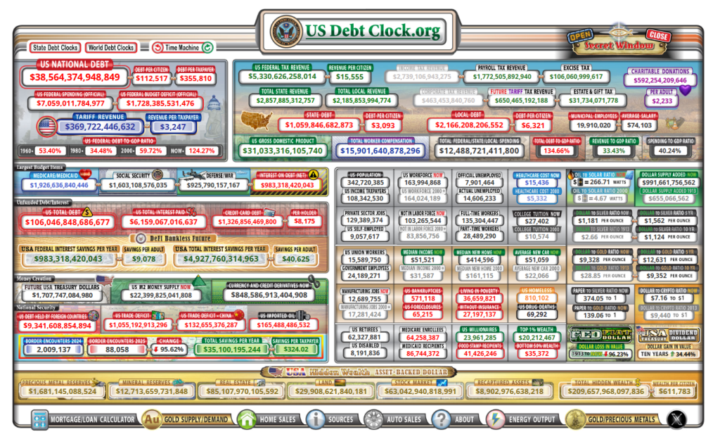A dashboard showing the US government debt, now over $38 trillion and climbing. Source: US Debt Clock