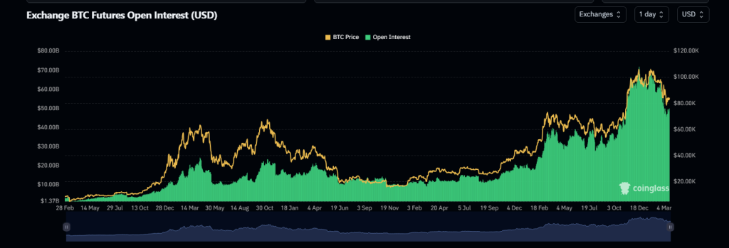 Data from CoinGlass shows that the firstborn crypto’s open interest dropped by 19%, from $61.42 billion to $49.71 billion, citing that the $12-billion shakeout might be a good thing for Bitcoin.