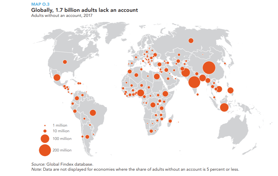 World Bank data shows that as of 2017, over 1.7 billion adults worldwide remain unbanked. And, about half of the people in Latin American and the Caribbean are either under or unbanked. That is, these people do not have a bank account or financial institution.