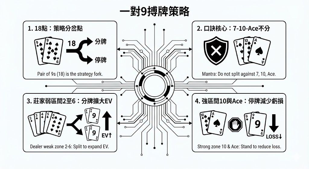 透過統計推演、莊家區間評估與風險結構拆解,可以將這類模糊牌型轉化為高度可控的盈利決策。本篇文章重新整理一對9的完整策略體系,並以「7-10-Ace不分,其余全分」為核心框架,讓玩家能在高壓局面下迅速作出最優決定。