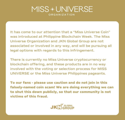 The Miss Universe Coin created a storm of controversy at the Philippine Blockchain Week (PBW) when it came to light that the coin, touted during the event and unveiled at a prior press conference, had no affiliation with Miss Universe, the brand and pageant owned by Thailand-based JKN Holdings.