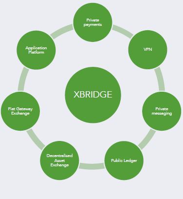 The XBRIDGE technology is capable of providing Private payments, managing a VPN, the private messaging, Public Ledger, Decentralized Asset Exchange, and the Fiat Gateway Eschange.