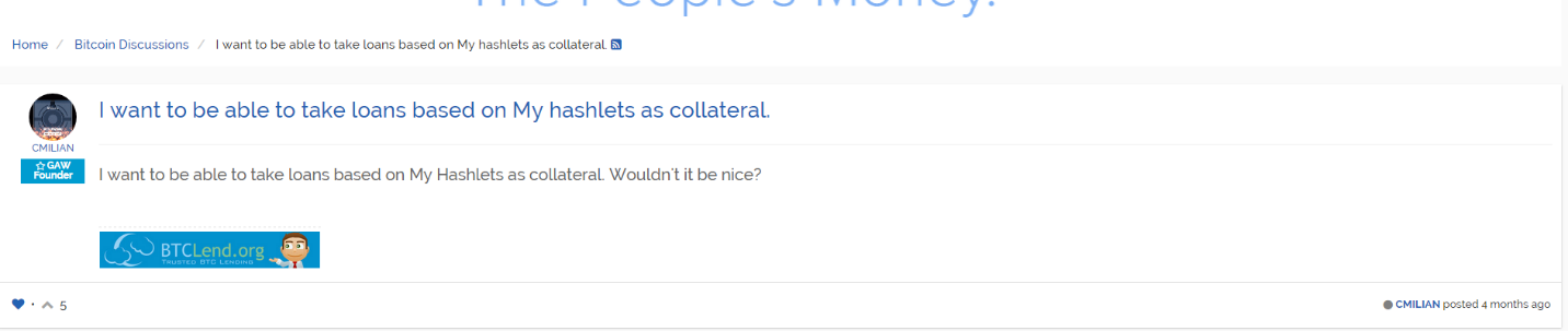 BTCLend launched January 17th in Miami at this year`s North American BitCoin Conference. We have over 850 registered users and have just integrated our first partner for collateral backed loans.