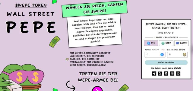 Alpha-Calls, Insiderwissen und eine klare Anlehnung an die Filme „The Wolf of Wall Street“ – der Wall Street Pepe Meme-Coin präsentiert sich seiner „WEPE-Army“ mit klaren Konzepten und Motiven. Gerade die eigene elitäre Community steht dabei immer wieder im Mittelpunkt und soll das eigene Wissen teilen, von erfahrenen Tradern profitieren oder an regelmäßigen Diskussionen teilnehmen.