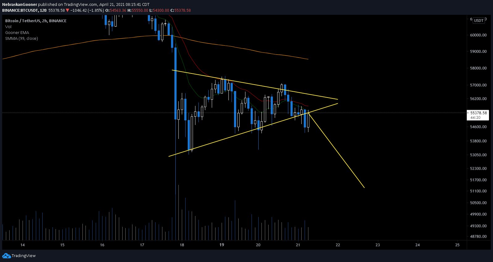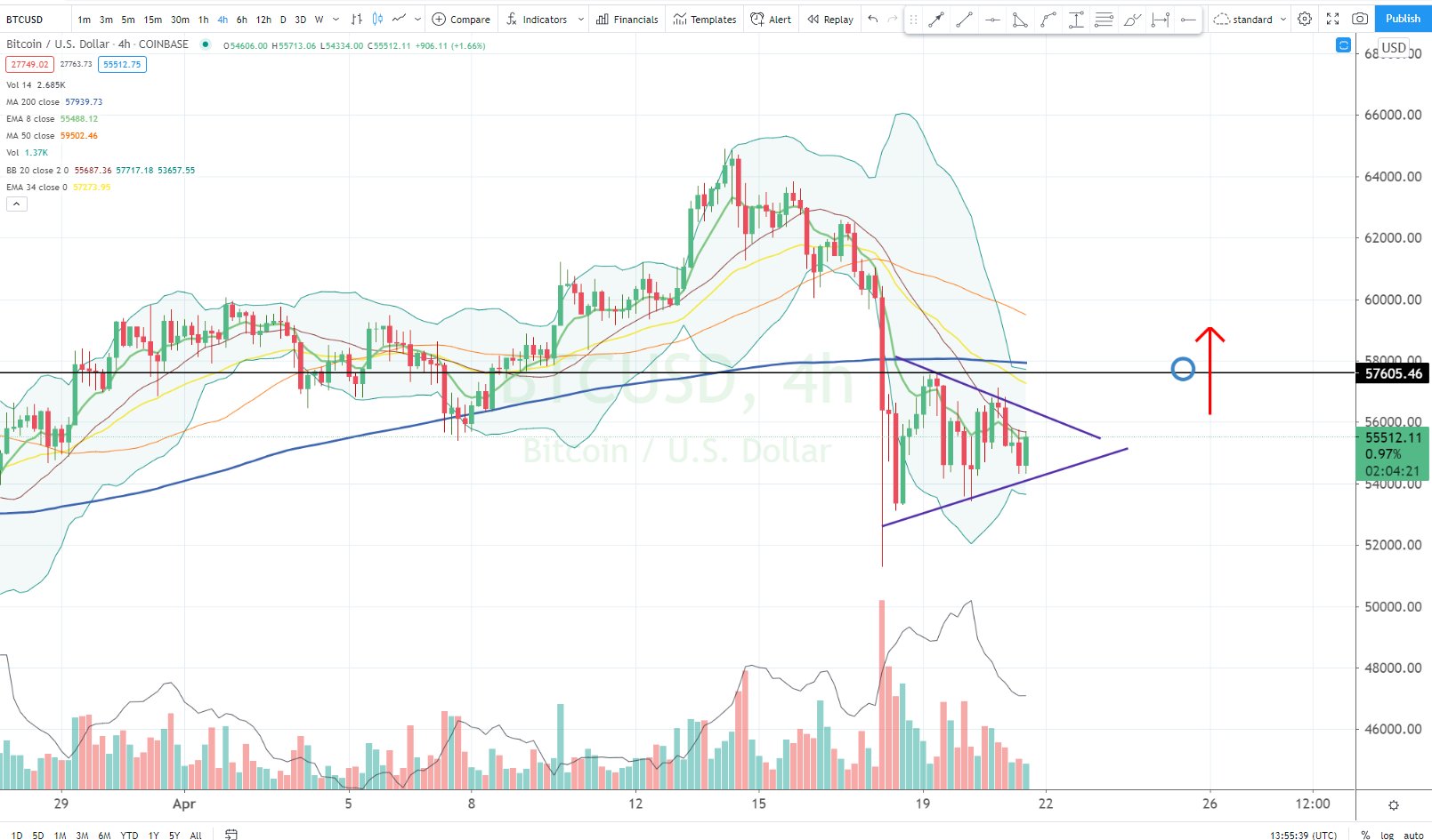 “Bitcoin 4H bear pennant just below SMA 200 nearing cradle (apex),” tweeted Cheds. “Break of SMA 200 and 57.6k would signify bulls taking back momentum.”