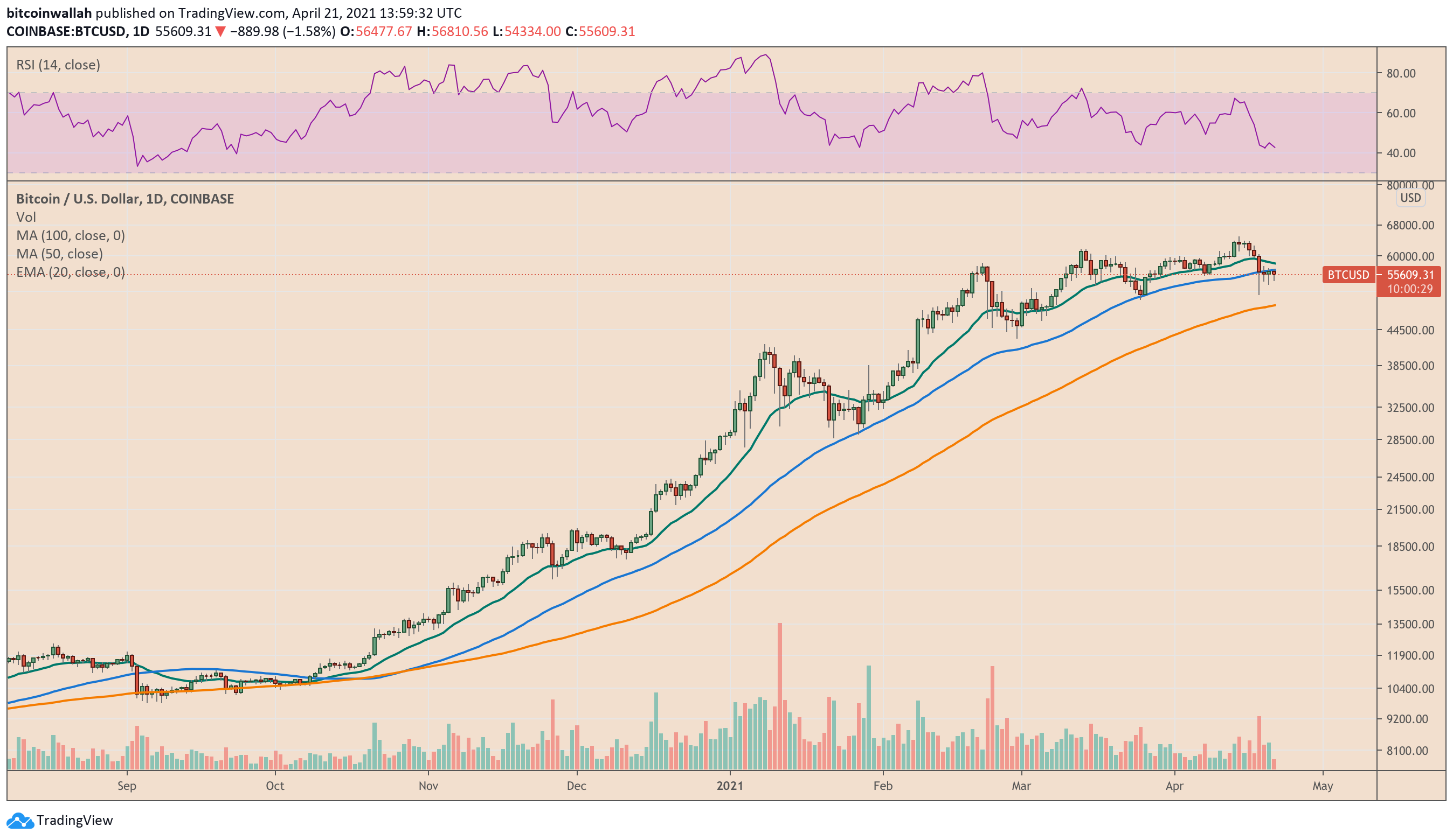 Additional evidence of $51,000 acting as an interim support level comes from the 100-day moving average wave that lurks just below it, around $49,000. Nonetheless, the Bitcoin price has been attempting to break above the 50-day moving average wave as of Wednesday. It is near $56,7000, as shown in the chart below.