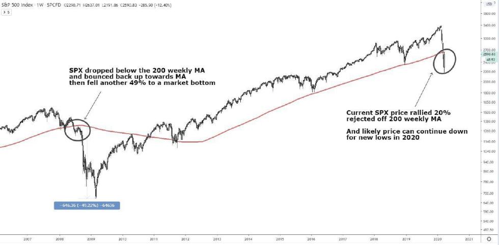 Josh Rager has posted a chart showing that the S&P 500 (SPX) has dropped below its 200 weeks moving average for the first time since the 2008 financial crisis.