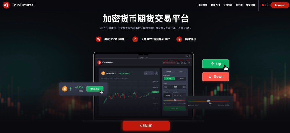 如果想考驗自己對加密貨幣投資眼光,也可使用CoinFutures,這是一個綜合表現優秀的加密貨幣期貨交易平台,主打無需KYC、免註冊帳戶即可交易,並提供模擬真實市場波動的遊戲化交易體驗。用戶可即時預測比特幣、以太幣等主流幣種的價格走勢,並選擇做多或做空,最高可使用達1,000倍的槓桿,亦支援止盈與止損設置。雖然平台不涉及實際加密資產,市場數據為模擬生成,但其高靈活性與免驗證的設計,對短期預測型交易者而言具吸引力。平台也支持隨時提領收益,操作門檻極低。
