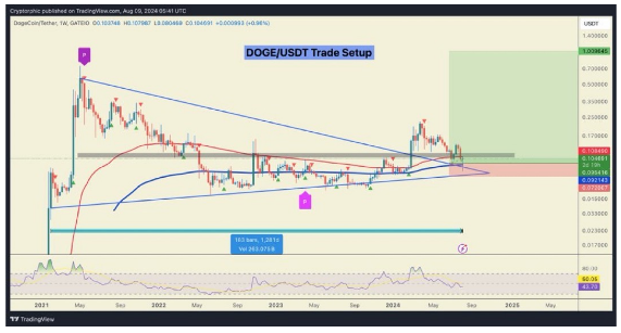 In an X (formerly Twitter) post on August 9, a crypto analyst identified as ‘Cryptorphic’ disclosed that Dogecoin has the potential to increase its value by tenfold. Basing his bullish sentiment on several technical and market factors, the analyst foresees Dogecoin hitting nearly $1 in the future.