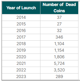 Amidst this sobering assessment, a glimmer of hope emerges in the data for 2023. The failure rate for coins launched in this year stands at a significantly lower 10%, with only 289 out of over 4,000 meeting their demise so far.