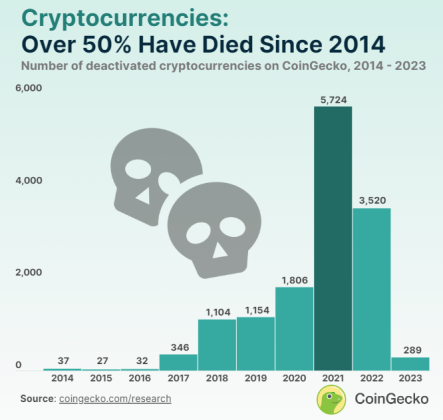 With 5,724 dead as of January 2024, cryptocurrencies introduced in 2021 have fared the worst. 2021 was the worst year for project launches, with over 70% of cryptocurrencies listed on CoinGecko dying.