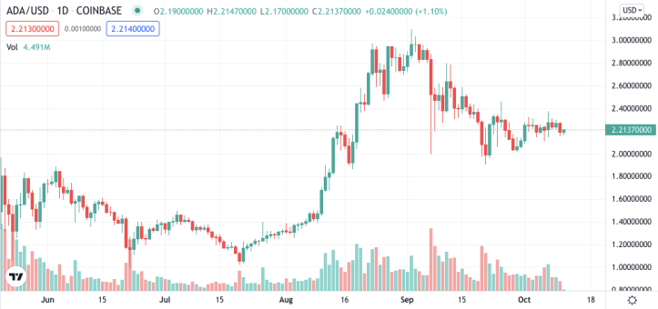 Cardano has been a name with increased chatter surrounding it's engagement in sports after last month's 2021 Cardano Summit. The summit was a showcase of numerous new partnerships for the 'Ethereum killer,' including esports firm Rival. | Source: ADA-USD on TradingView.com