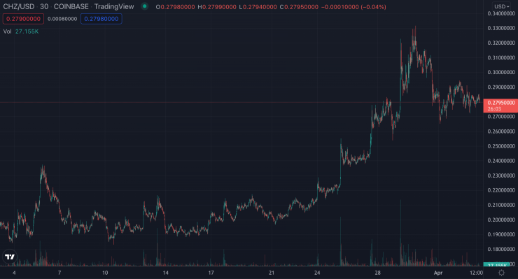 Chiliz is a routine name in The Sports Slice, and is back for more this week with a headline-smashing deal with legendary football star Lionel Messi. | Source: CHZ-USD on TradingView.com