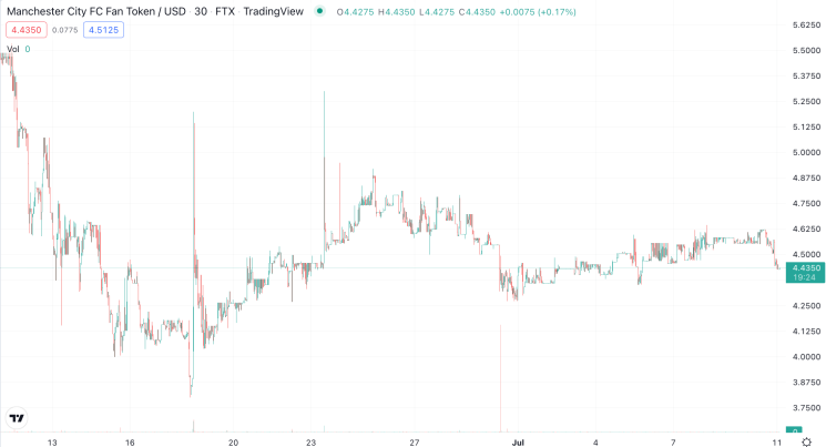 Manchester City, one of the premier football clubs across the globe, released a fan token courtesy of a partnership with Socios, and has signed on OKX as an official cryptocurrency partner. | Source: CITY-USD on TradingView.com