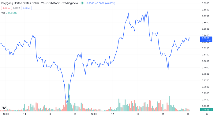The DraftKings Reignmakers platform in partnership with the NFLPA operates on Polygon (MATIC). DraftKings Reignmakers recently announced a new collaboration with NFT collection Deadfellaz. | Source: MATIC-USD on TradingView.com