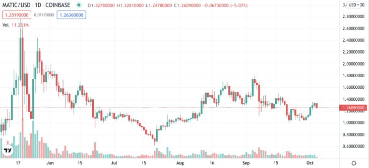 Polygon (MATIC) has dipped toes in the water with sports engagement with a collaborative liquidity funding initiative for Augur Turbo. Sports betting engagement with crypto firms at a high level has been limited thus far, primarily highlighting DraftKings partnership with Autograph.io. | Source: MATIC-USD on TradingView.com