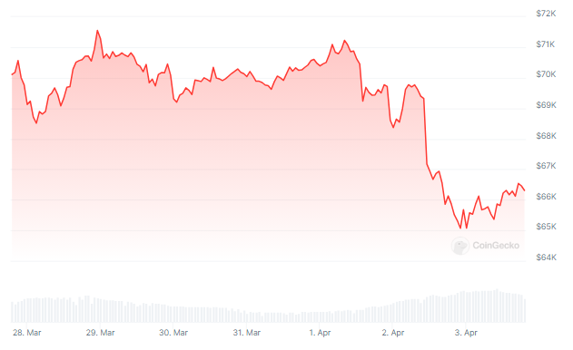 With less than three weeks until the highly anticipated Bitcoin halving, the crypto market is facing a period of turbulence. Bitcoin (BTC), the world’s leading digital asset, has shed over 12% of its value in the past week, dipping below $66,000 for the first time since late March. This downturn comes amidst broader market anxieties, raising questions about the short-term future of Bitcoin and other cryptocurrencies.
