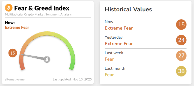 Santiment and other data providers point to extreme pessimism across the market. Based on reports, the Crypto Fear & Greed Index returned a score of 15 out of 100 on Thursday, a reading labeled “extreme fear” and the lowest since March.