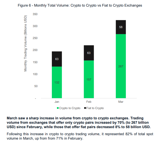 Figure 6 shows the distribution of volume between crypto-to-crypto and fiat-to-crypto exchanges.