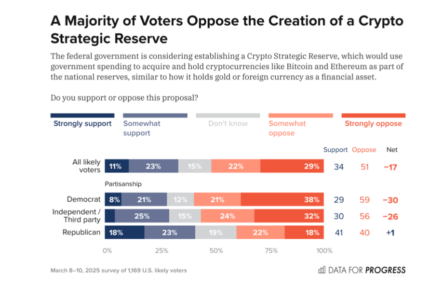 Data for Progress asked 1,169 American voters using web panel respondents if they support or oppose the proposed crypto strategic reserve. The survey was conducted from March 8 to 10, 2025, after Trump signed an executive order that establishes the US’ Strategic Bitcoin Reserve.