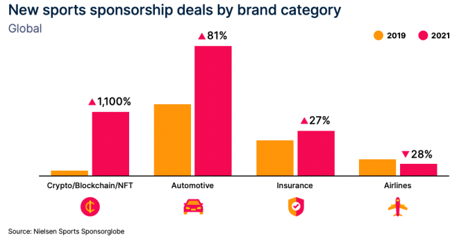 From the past two years of immense growth in the “crypto/blockchain/NFT” category, Nielsen projects strong performance in sponsorship spend to continue. The firm’s 2026 forecasts include single digit percentage growth for traditional sports sponsorship categories like automotive, retail, and energy sectors. Nielsen projects double digit percentage growth for the “IT software/hardware” category, and a massive 778% growth of the aforementioned blockchain category.