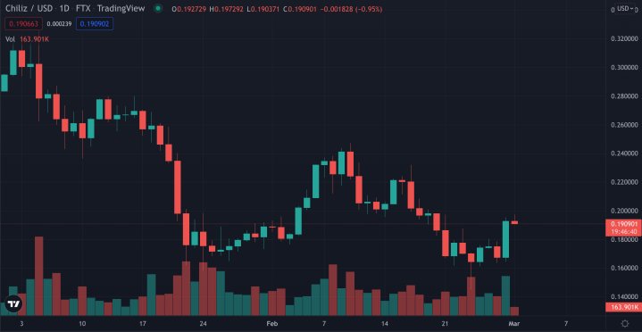 Chiliz (CHZ) is one of the industry leaders in fan tokens, which stand to be well-positioned in the sports fan engagement landscape - but it remains to be seen the true potential of fan tokens, and if Chiliz can hit the spot. | Source: CHZ-USD on TradingView.com