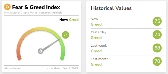 Meanwhile, analysis by Alternative indicates that the Crypto Fear & Greed index is still rising into “Greed” area, with a current score of 74 out of 100, the highest since November 2021, when Bitcoin reached an all-time high of $68,790.