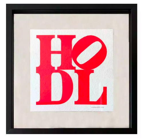 Some crypto-inspired works of art have fetched relatively high prices at auction. Based off of Robert Indiana’s LOVE work, cryptograffiti created a series of serigraphs on “used central bank” money bags that substituted LOVE for HODL.