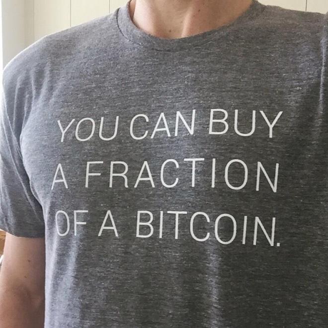 CG: YOU CAN BUY A FRACTION OF A BITCOIN has started the most conversations. I recently wore it to the gym and this JACKED…like 350 lb. dude with neck tats came up to me and I thought he was going to tell me to get off his rack or something but he said, “Nice shirt. So, what do you think? Is OmiseGo gonna correct?” But, usually it’s someone saying “I didn’t know that (you could buy a fraction).”