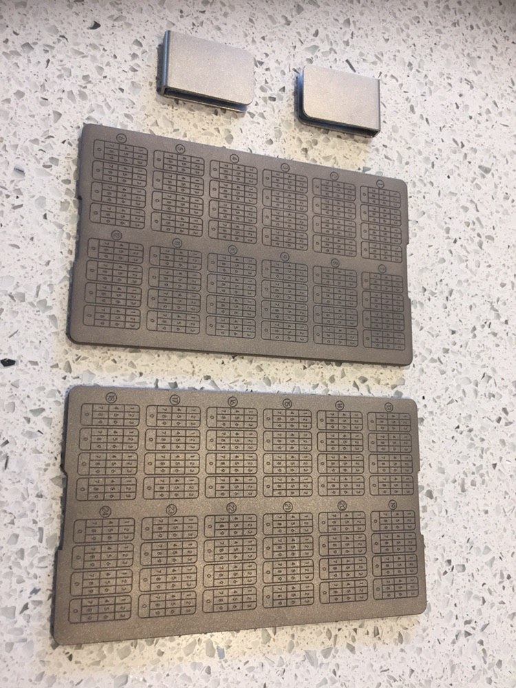 When you take off the two clips at either end of the CRYPTOTAG Zeus Starter Kit and pull the plates apart, it reveals 24 individual BIP39 code boxes inscribed into the metal. Each of these boxes contains the numbers 0-9.