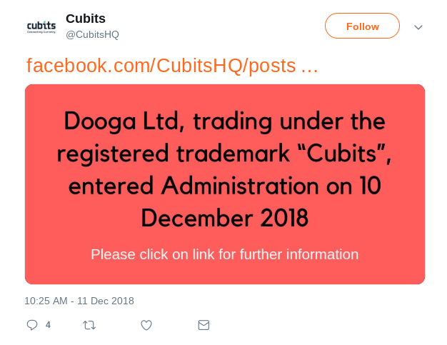 In a press release dated December 11, Dooga Ltd., the UK-based entity trading as Cubits, claimed “collusion” which resulted in a “criminal act” involving the loss of €29 million ($33 million) in February 2018 had forced it to shut down.