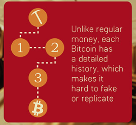 Unlike regular money, each Bitcoin has a detailed history, which makes it hard to fake or replicate.
