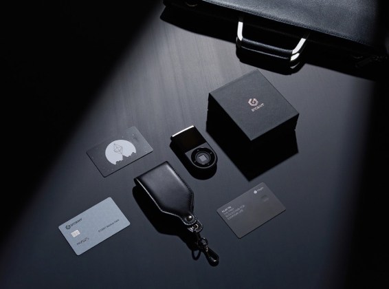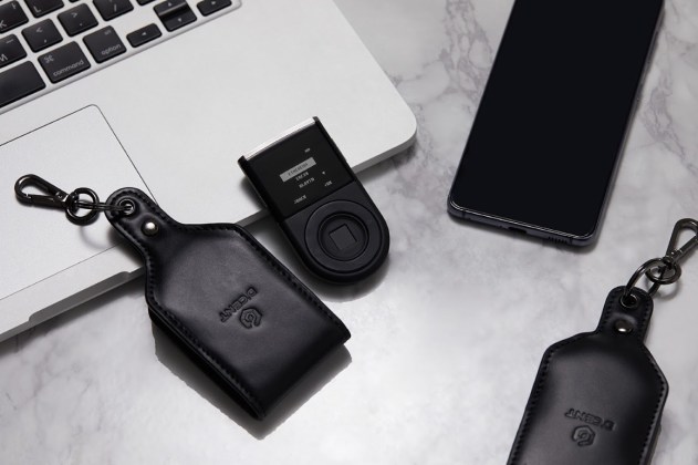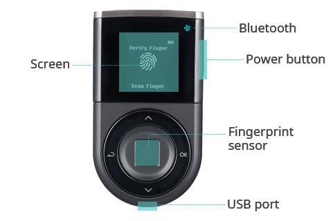 This is the most important product. It looks like a small device about the size of a car key fob. The front has a fingerprint sensor built in. The device connects to your phone through Bluetooth. It also has a USB-C port for charging and direct connection to a computer.