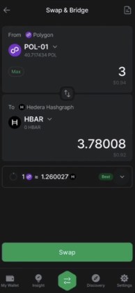 The app includes a swap feature called D’CENT Swap. It combines three functions: bridging, cross-chain swaps, and standard token swaps. Users can move assets between different blockchains without leaving the app. The interface shows gas fees upfront so you know what you are paying before you confirm.