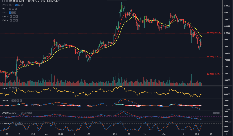 As recently as May 2, BNB was consolidating between $25 to $21 and posting daily lower highs. It’s clear that altcoin was losing strength as it struggled to stay above the 12 EMA The bear cross on the daily MACD corresponds with the April 26th news of Bitfinex misappropriating $850 million USDT to cover their own losses.