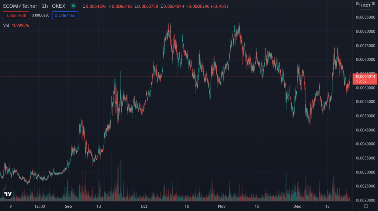 VeVe utilizes it's in-house blockchain protocol, ECOMI, to power environmentally-friendly NFTs with a primary focus on collectibles centered with impactful IP and brand recognition. | Source: OMI-USDT on TradingView.com