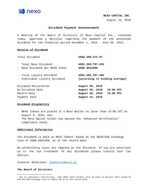 Nexo is delighted to announce that the Dividend Payment of US$2,409,574.87 to NEXO Token Holders scheduled for August 15, 2019, is now complete.