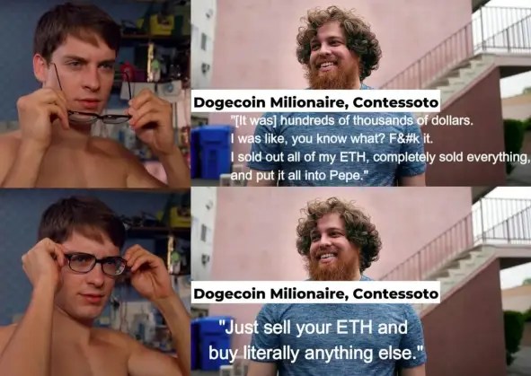 เมื่อเดือนกุมภาพันธ์ 2025 รายงานจาก Binance Square เผยว่า Contessoto นักลงทุนที่เคยสร้างชื่อจากการถือ Dogecoin จนกลายเป็นเศรษฐี เปิดเผยว่าเขาตัดสินใจขายพอร์ต Ethereum ทั้งหมดเพื่อนำเงินไปลงทุนในเหรียญมีมชื่อดังอย่าง Pepe ($PEPE)