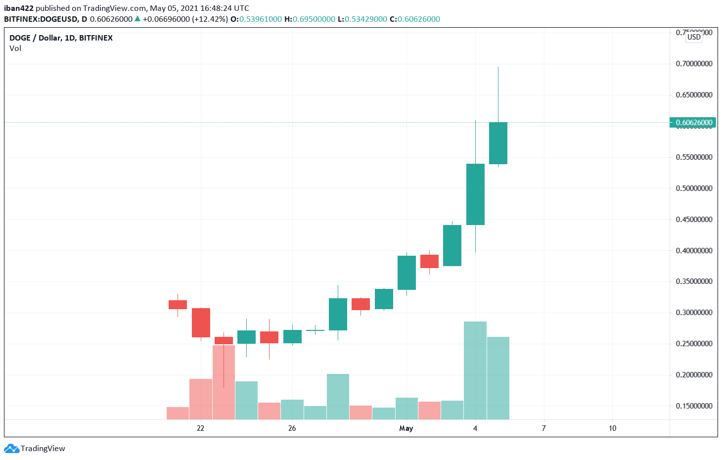 According to Coin Metrics, the price of Dogecoin increased by approximately 40% on Tuesday. After bitcoin, Ethereum, and Binance Coin, Dogecoin now has a market cap of $69 billion, rendering it the fourth-largest cryptocurrency.